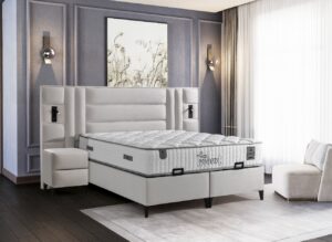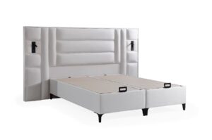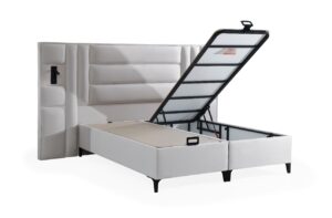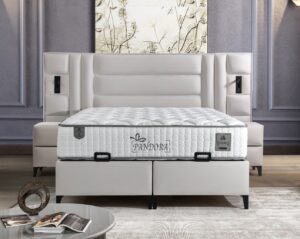 Patul “Pandora” este tapitat intr-o catifea bej, de inalta calitate. Are dimensiunea saltelei de 160×200 cm, avand un cardu solid de metal si o lada de depozitare cu acces printr un sistem pe pistoane de aer.